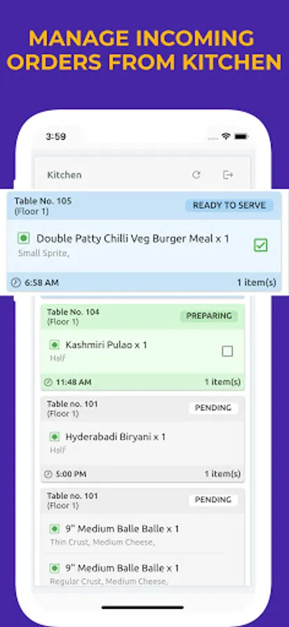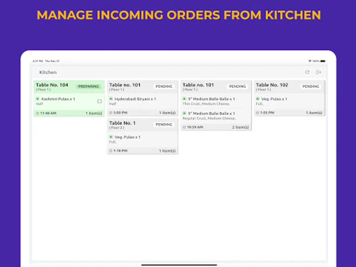 Manage KOT with print or screen in kitchen which feature to update order status.