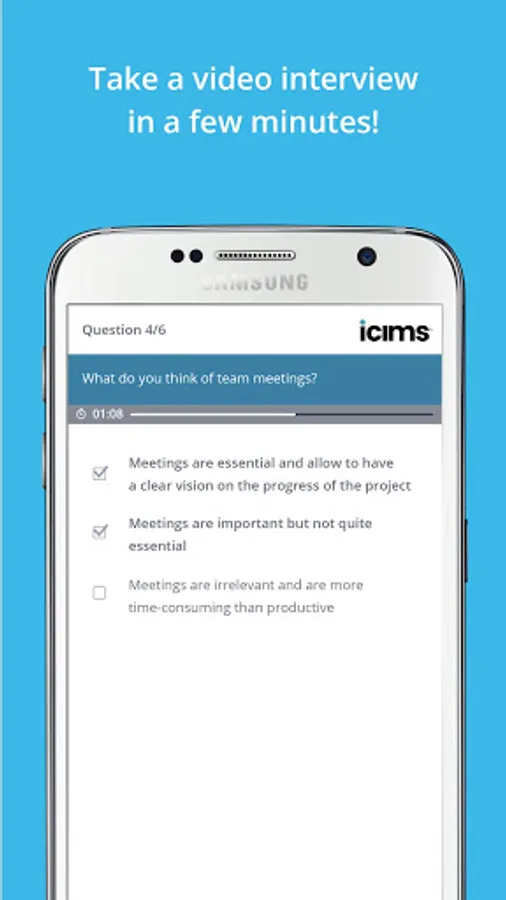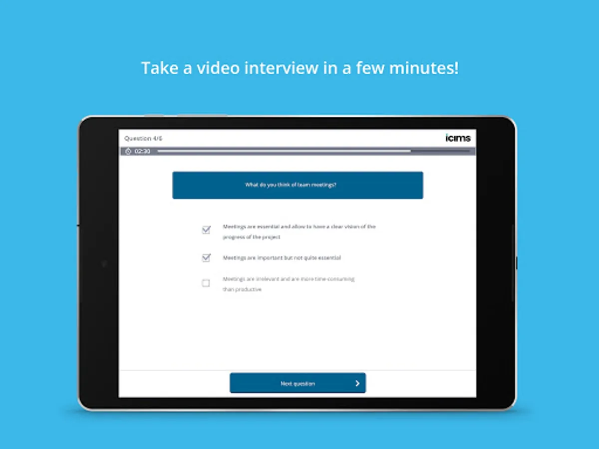 Congratulations! You have been invited to take part in a video interview. The iCIMS app is free and lets you record your video interview with your mobile. iCIMS gives you the control and flexibility to complete the interview whenever and wherever you like. Our role is to get candidates and recruiters to know one another through a richer and engaging video experience.