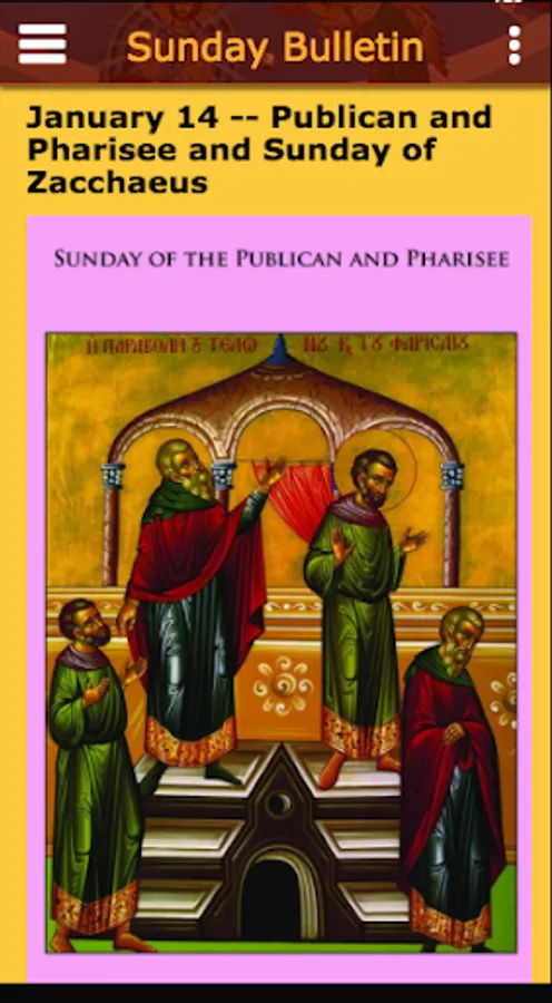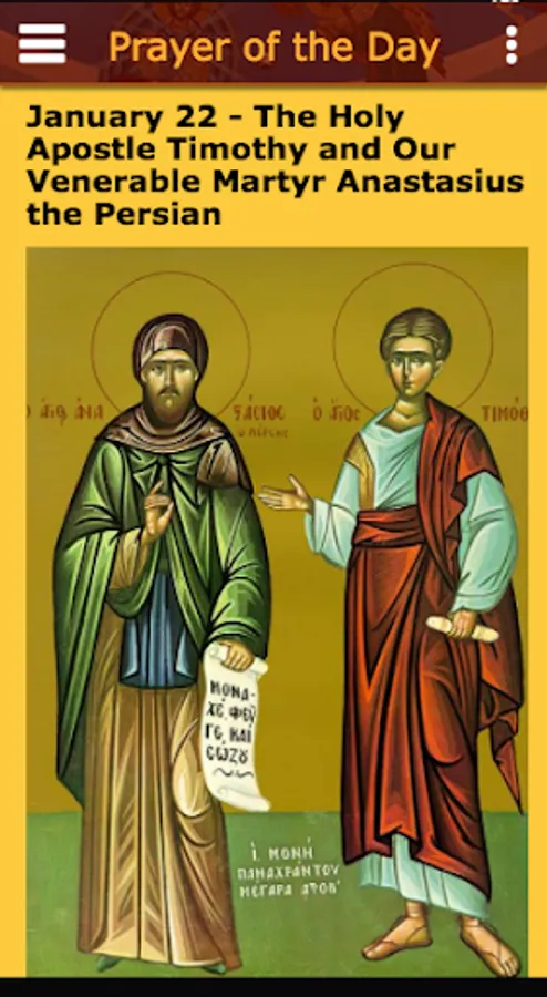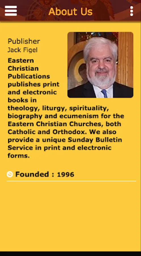 This app includes an icon and prayer for the saint of the day, daily reflection from the book "Java with Jesus," The Byzantine Daily Office Hours and Vespers, weekly Sunday bulletin icon and reflection, an electronic version of the monthly Eastern spirituality magazine Theosis, and a featured book of the month from the catalog of Eastern Christian Publications.
