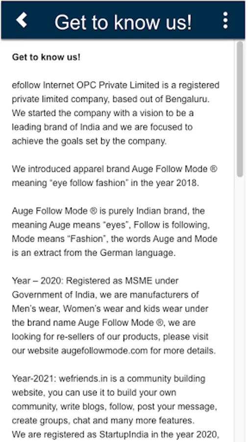 efollow application will keep you posted on the latest products and services introduced by us and this application will help you to shop, make friends, build community group, create # tags, write blogs, create your own photo Albums, chat, create technology forums and many more services.
