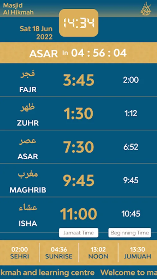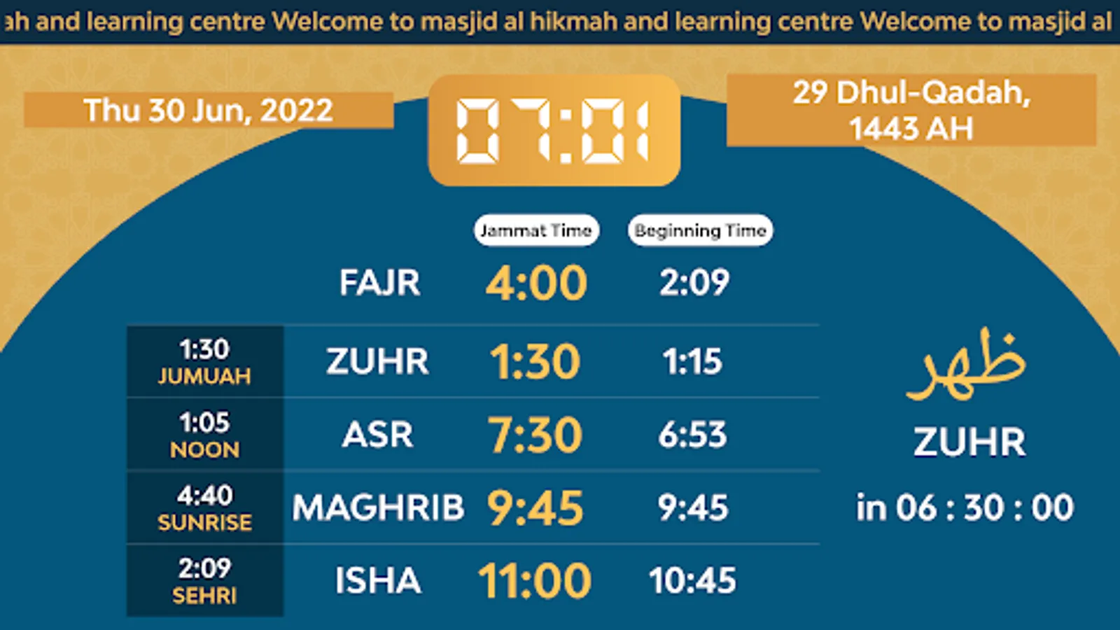 Al Hikmah Masjid Timetable app features prayer times and comes with an accurate qibla finder.