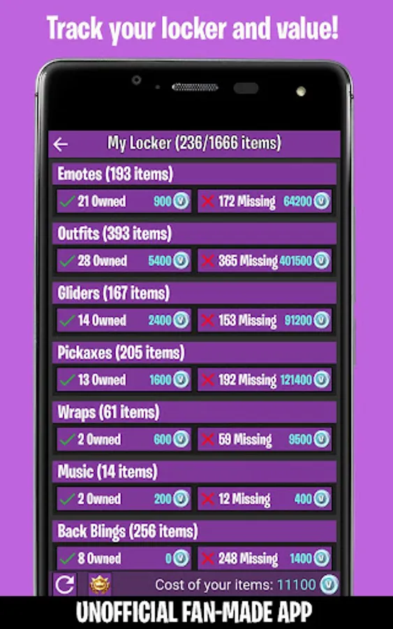 ★Use the My Locker feature to keep track of all your Fortnite Cosmetics, see what is missing or what the total vBucks value is of your items.