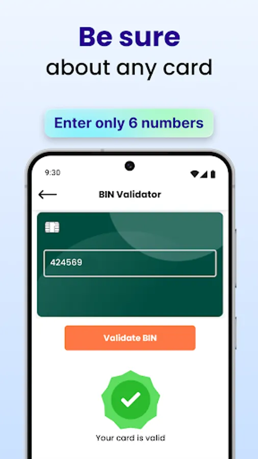 Never worry about the validity of your cards again. With our virtual credit card manager, you can instantly validate your credit cards with a tap. The credit card app features a BIN checker that verifies credit, debit, and IBAN numbers, providing you with the details you need in seconds. Whether you're checking for authenticity or want to confirm card details, this credit card manager has you covered.