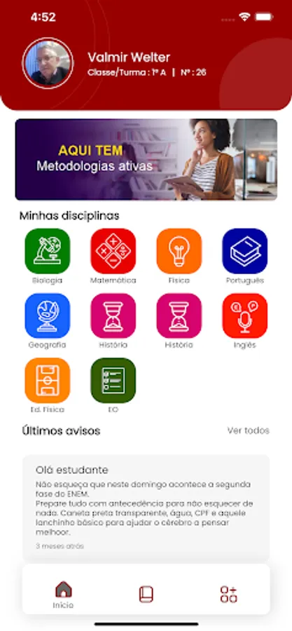 Built for active learning methodologies, the Escola Digital app is ideal for students to have access to content in videos, pdf texts, website links and external platforms. In it, the student follows his own development in real time, performs online tests and assessments, receives messages, has access to class schedules and homework activities.