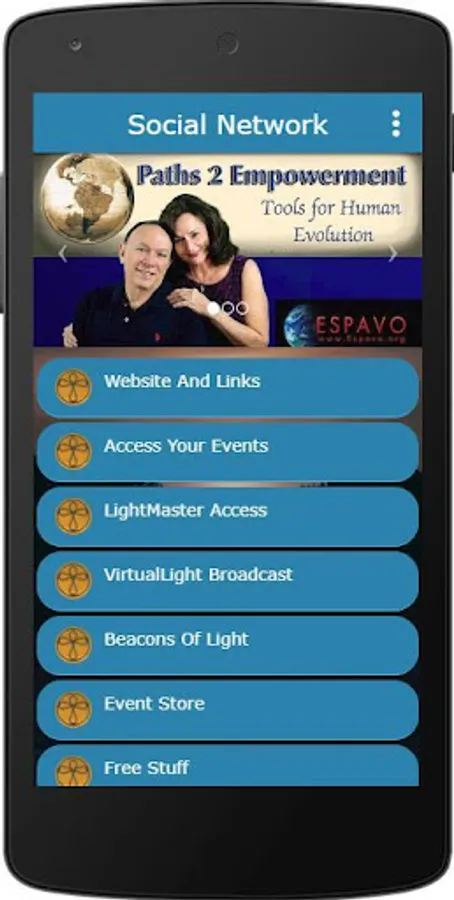 Welcome to the Espavo app. This app gives the most used areas of both Espavo.org and Paths2Empowerment.com. Spiritual information for evolving humans channeled through Steve and Barbara Rother. They are 5 time presenters at the United Nations with this material. App includes many videos to help you see the evolving world and the new information useful in the 5th dimension. Includes the VirtualLight Broadcast a free video broadcast each month. It also includes a monthly Predictions, Comments and Questions free of charge along with full access to our events store. Brought to you by ESPAVO - a 501(c) (3) non profit organization.