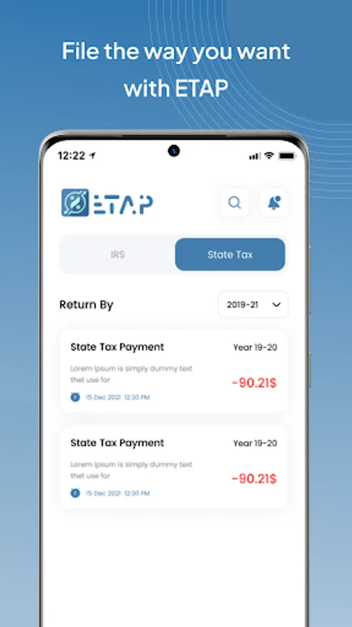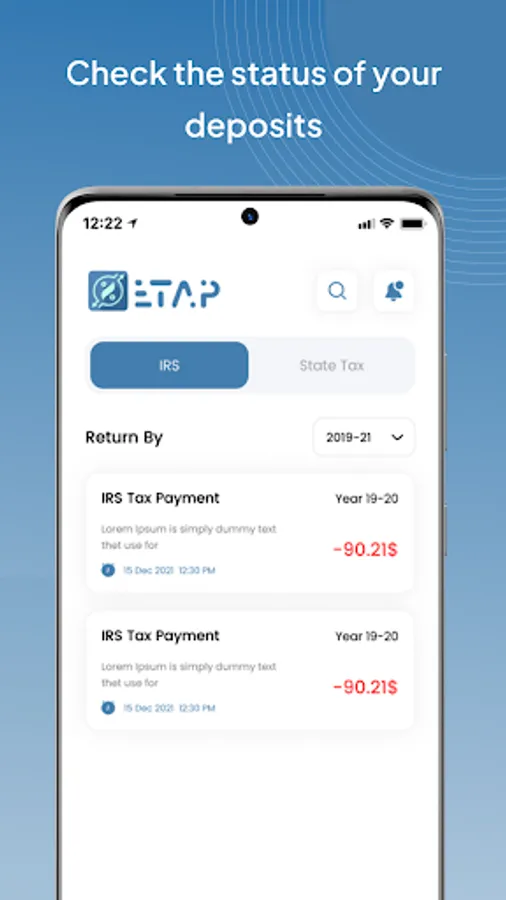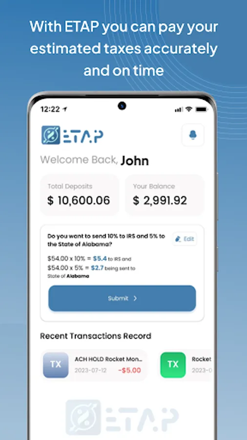 ETAP is an automated percentage-based app that helps independent contractors and small business owners pay their estimated taxes on time. ETAP automatically calculates a percentage of your monthly or quarterly income from your bank deposits and sends that amount to the IRS and your State, if need be. This is a much more accurate way to pay your estimated taxes than simply sending in a set amount each month or quarter. ETAP saves you time, hassle, and gives you peace of mind knowing that your estimated taxes are being paid on time and accurately.