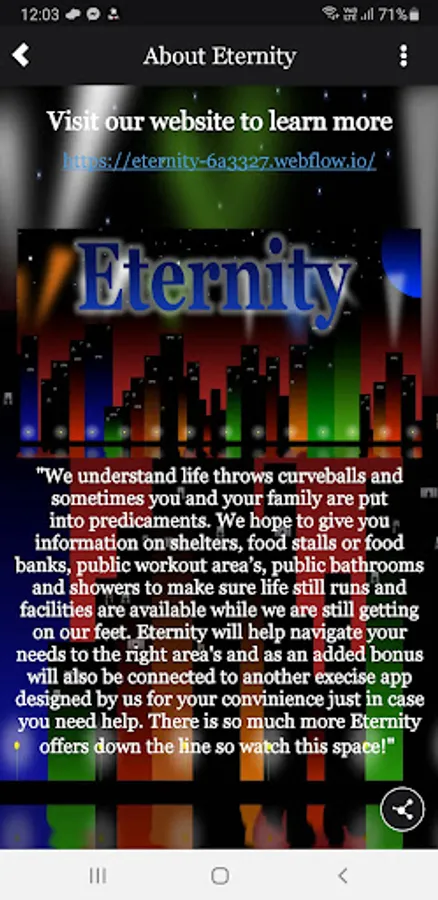 EternityNZ is an app focussed on helping NZers navigate through these hard times. Whether you have been evicted or flooded out of your home nomatter what the reason may be, we have designed an app that has done the navigating for you and we have connected helpful links to websites that will get you what you need faster. We are very sorry for the situation you're in and hopefully our app helps you get on your feet faster. We have helped countless families find shelter, food, bathrooms etc. We concentrate on helping those in need. EternityNZ is for our NZ people only as we can only help those in our own backyard. We will be looking to expand but for now we start with NZers finding shelter, food, bathrooms etc.....