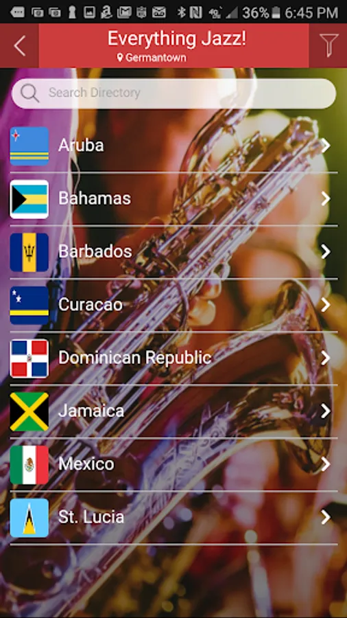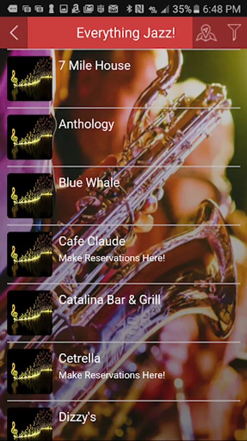 Jazz Clubs: The Jazz Clubs are also categorized by state. Each club listing provides a brief description, address, contact info, and a link to the jazz club’s website. It also contains a link to make reservation directly from the app! (only open table participants)