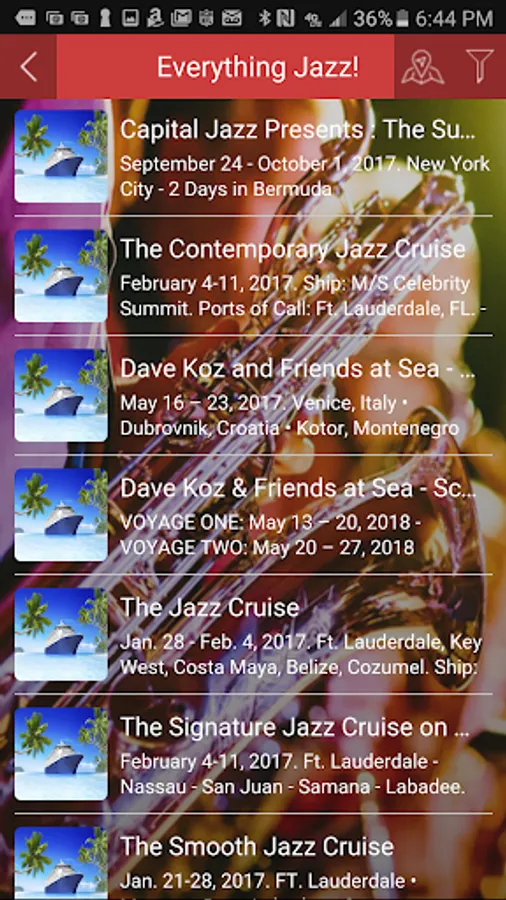 Jazz Cruises: The Jazz Cruise listings provides brief description, cruise dates, ports of call, contact info, and a link to the jazz cruise website.