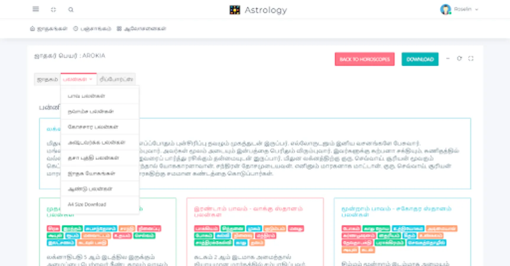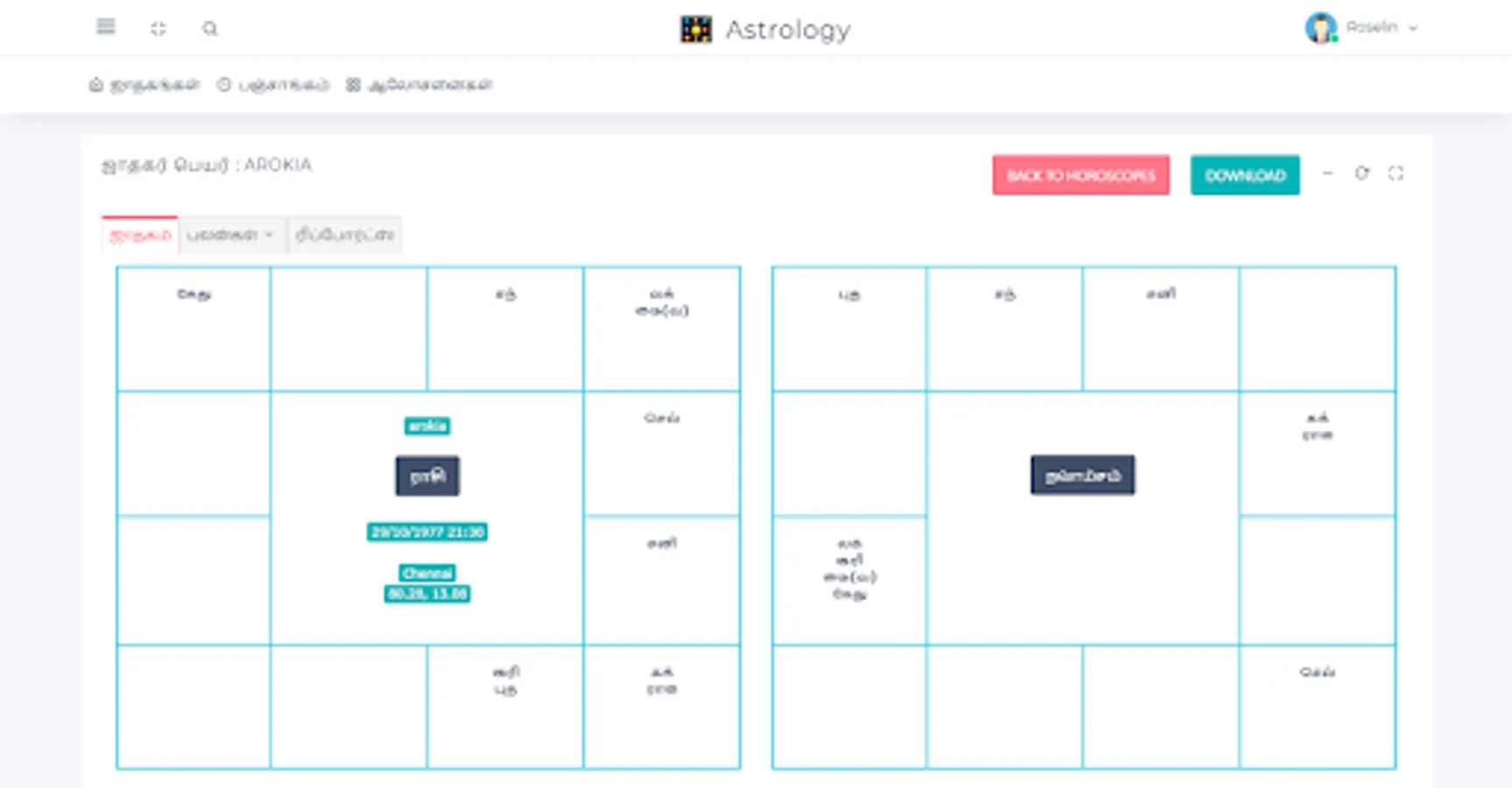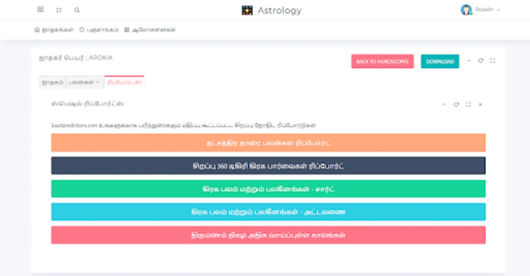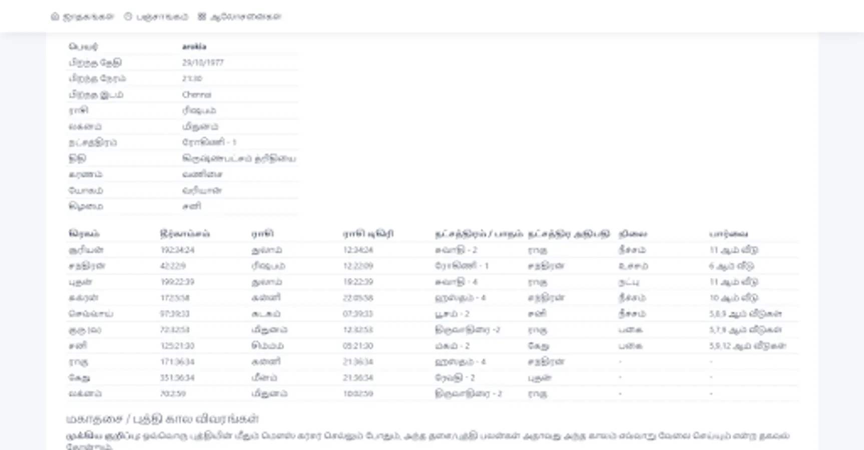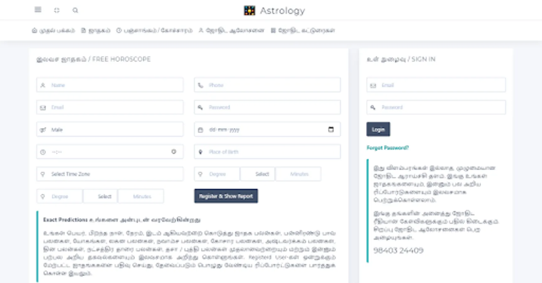 Users can generate their Birth Charts, Planet Transit Reports, Numerology Reports and many other special Vedic Astrology Reports in Languages Tamil and English