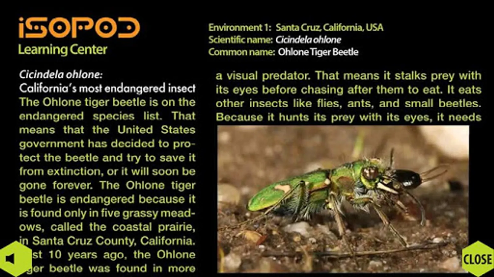 Playing the game is instant access to fun: The Isopod rolls up into ball and is then controlled by accelerometer-based "tilt-physics" that transforms the android into a game controller. As the user rolls and bumps their way through levels, new environments filled with indigenous creatures appear. Every interactive element has its own set of topic pages, and new topics open as the player succeeds in gameplay.