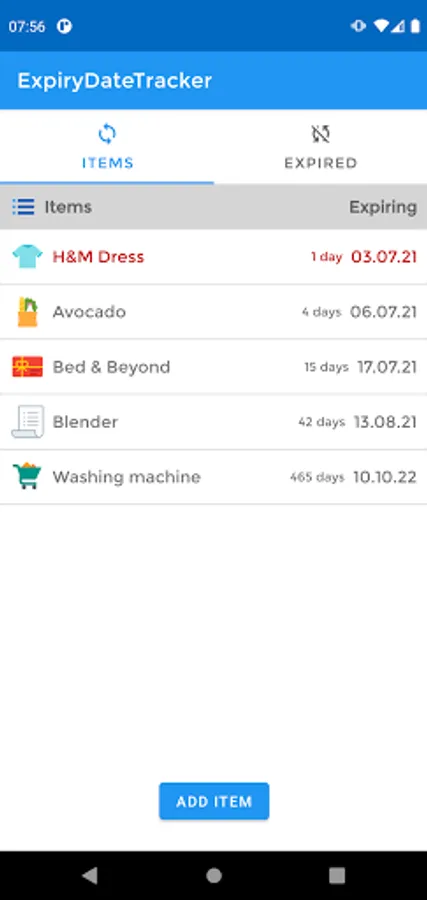 The ExpiryDateTracker-App will help reminding you of expiration dates on your purchased goods. Two days before the item expires you will receive a push-notification to remind you that the item soon expires.
