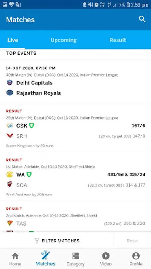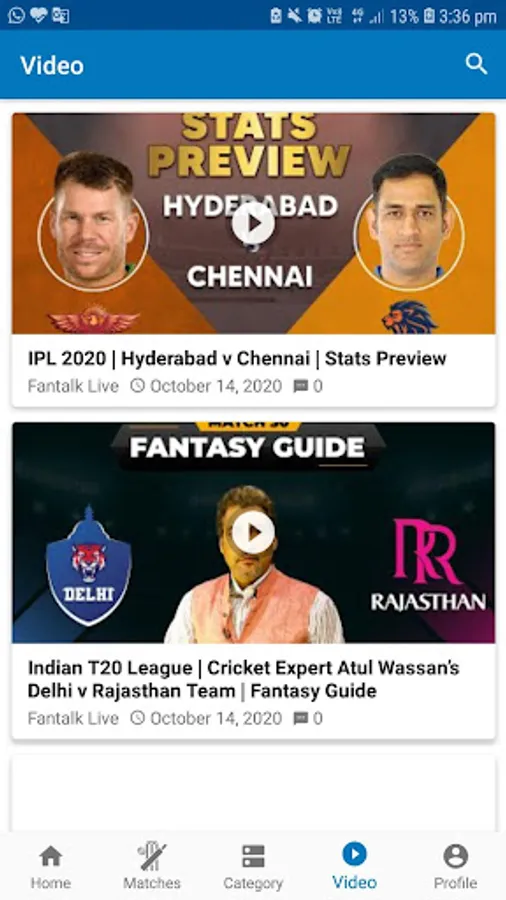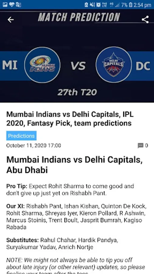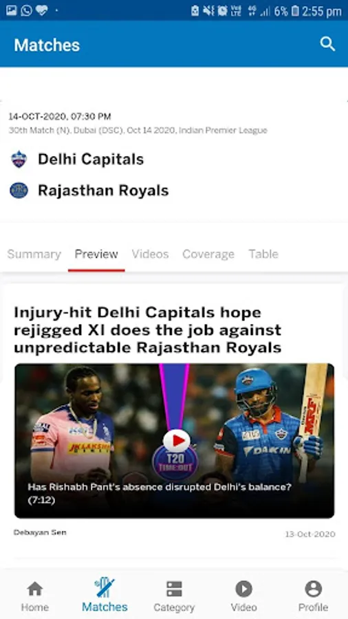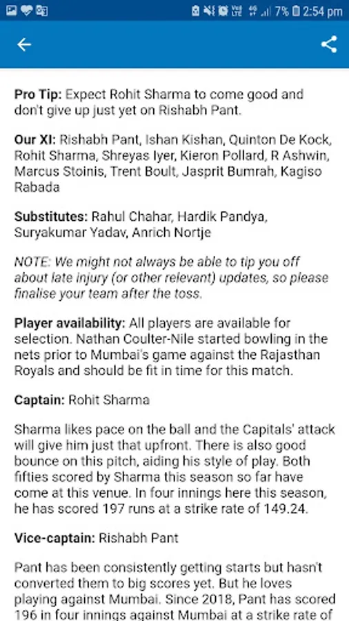 * Match Previews: This screen provides 'Fantalk' for both playing teams, squad details and pitch report.