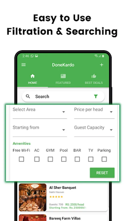 Download the best and easy-to-use booking app in Pakistan (currently operating in Karachi). Done Kardo App provides you the best and updated deals regarding Wedding Halls, Banquets, Lawns, Hotels, Villas, and Farm Houses with easy-to-use filtration and searching features that will allow you to search your desirable event booking place in some tweaks.