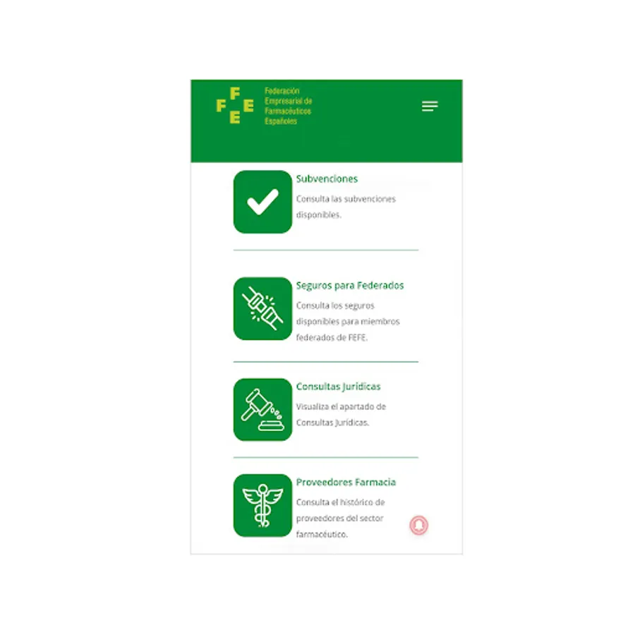 Official application of FEFE, Business Federation of Spanish Pharmacists, with which you can, if you are federated, access all the current information on the sector, as well as use the schedule of laboratory visit requests, take advantage of FEFE Privileges, discounts on a multitude of businesses, brands,... manage your patients' appointments, as well as have first-hand information about grants, aid, events, training...