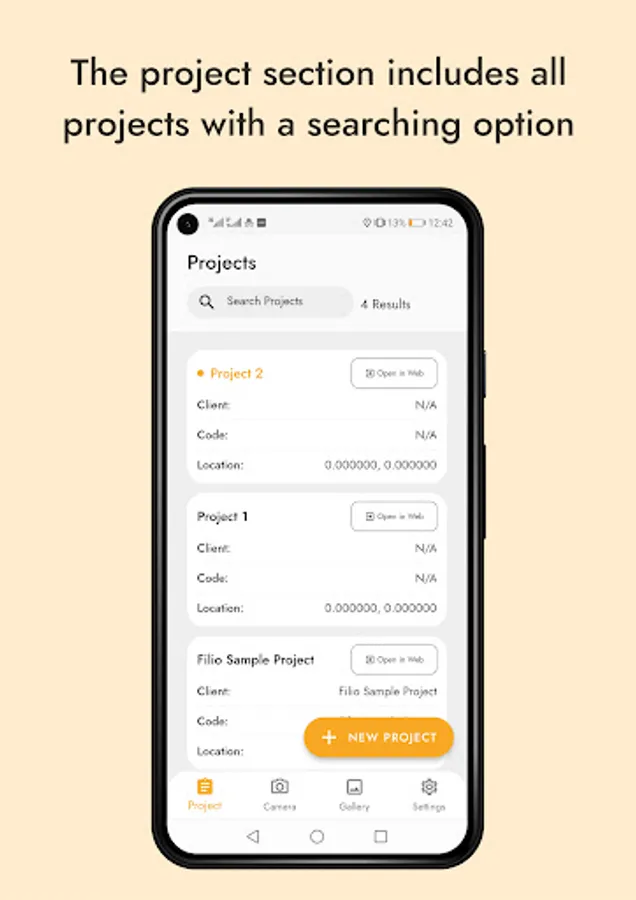 2) Start taking photos and videos for the sample project automatically created by Filio.