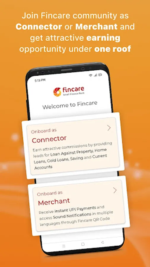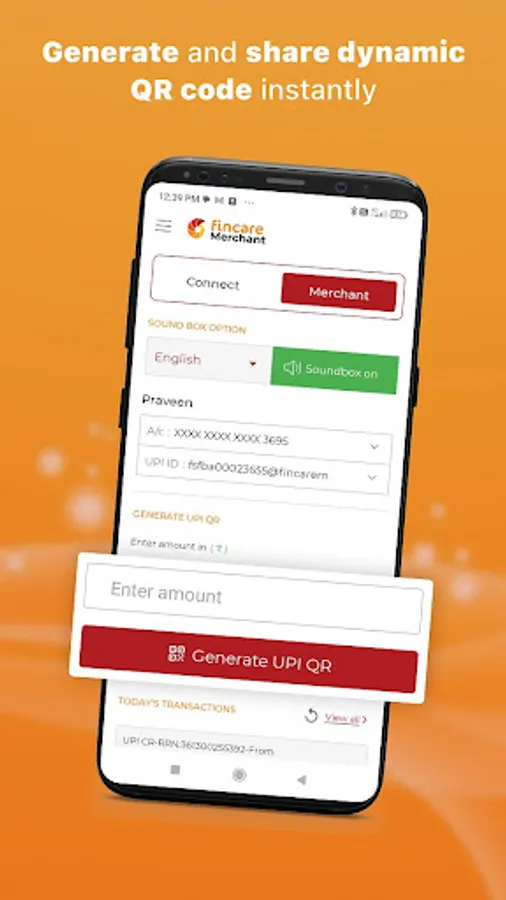 • Activate the merchant section through a Fincare representative to get a QR code linked to bank account.