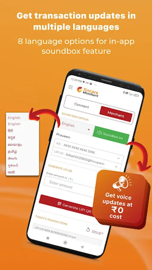 • Seamless merchant login with multiple language sound box notifications, QR code generation, and transaction history all in one app.