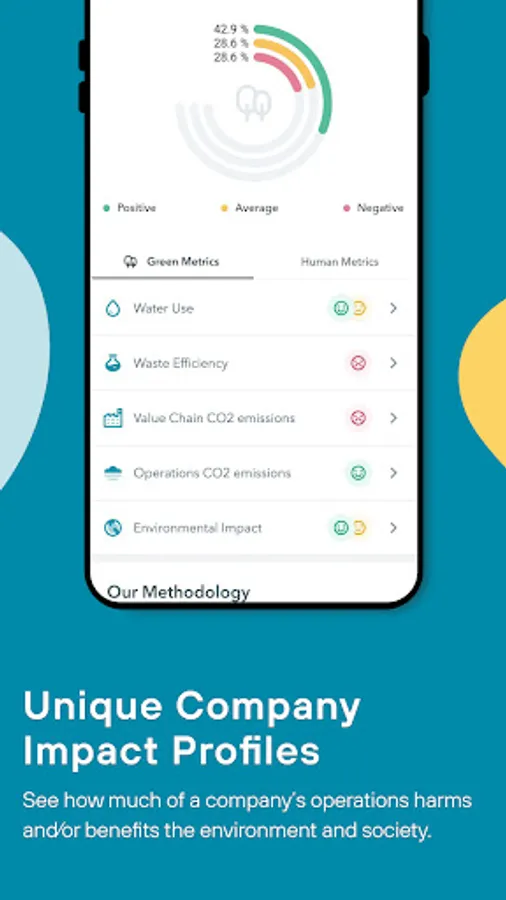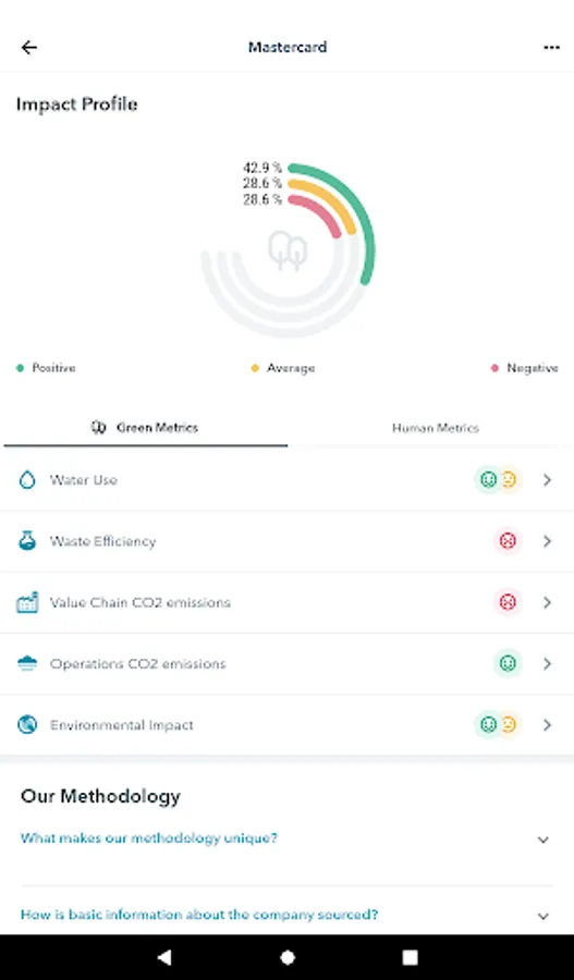 Each company is analyzed in terms of its environmental, social, and governmental impact and how it performs in comparison with the rest of its industry. The company is evaluated against 14 Impact Metrics and given a “positive” “negative” or “average” flag. You can look at the company’s profile and see how much of its operations harm and/or benefit the environment and society.