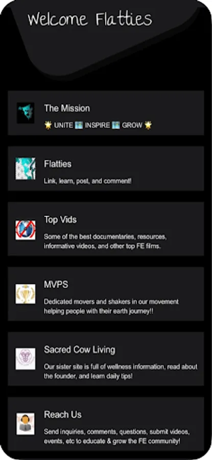 Flatties is the app for individuals that care about our earth, health, wellness, and unity. Level up your earth journey! Here you will find other people on the same track as you, daily activities, tips, and information to stay on track; body, mind, and soul. Each tab is designed to help you learn new ways of applying conscious lifestyle techniques and Sacred Cow Living’s lifestyle enhancement concepts. Please enjoy this free platform to enhance your life