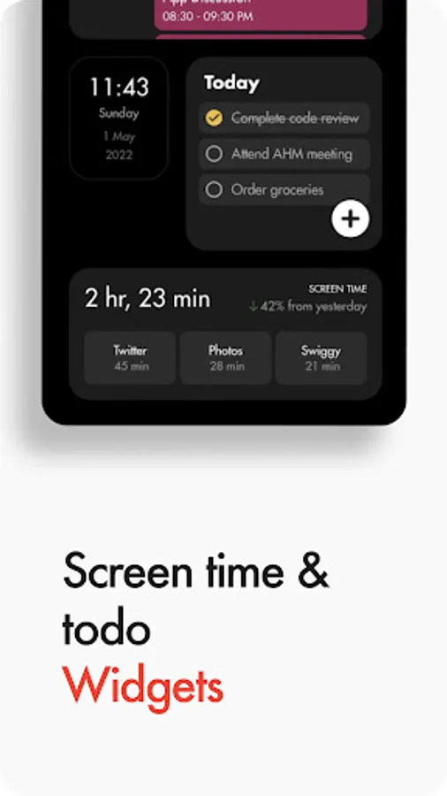 On Swiping right from the home screen you get a set of productivity and essential widgets. Calendar 📆 widget that shows your google calendar events for today.A date-time 🕰 widget. A quick to-do list 🗒 that you can add and delete. And the best part...a screen time widget that shows your screen time for the day which keeps you informed about how much time you have wasted so that you will be more focused today. It also says how you performed compared to yesterday. Also, the top 3 apps usage for today and their screen time. All this combined makes it the only perfect productivity app for Android. It's all you need to take control of your time, productivity, focus, and attention.