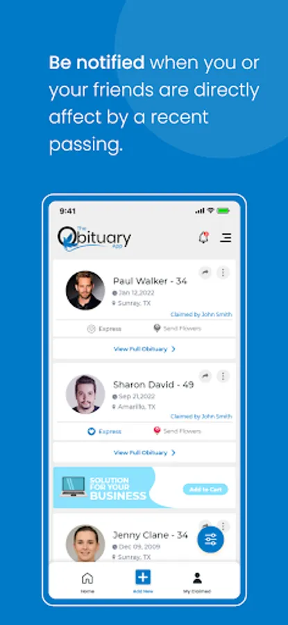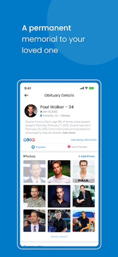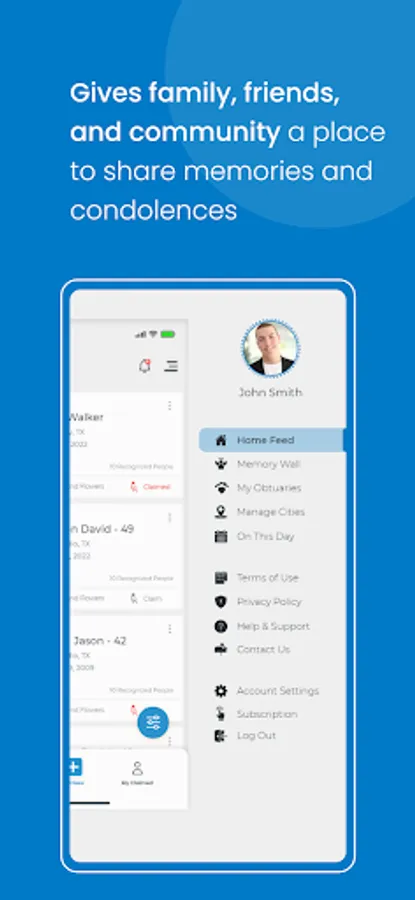 A feed consists of Obituary cards, similar to a drivers license; An obit card consists of the decedent's name, photo and age (if available), the city in which the death took place, and multiple functions for the user. A user can express condolences, send flowers through the funeral home website, view the full obituary, share through email or social media, save to one's own personal memory wall, indicate an intention of attending the funeral or memorial service, or report the obituary for misinformation.