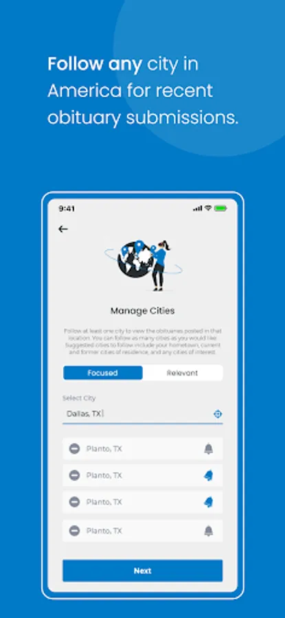We encourage larger towns to be placed in a user’s “Focused” feed. Here users will see only obituaries from funeral homes in that city or deaths that have taken place in that city.
