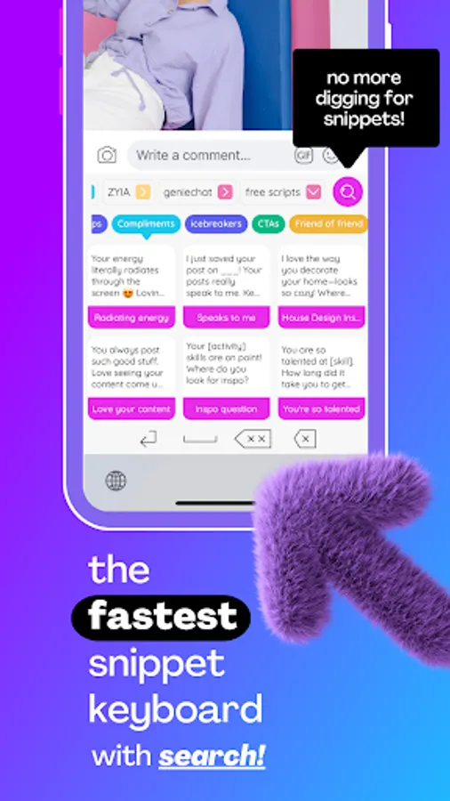 Getting the conversation going and knowing what to say to not be icky and salesy is so stressful. Well, now you never have worry about what to say with the geniechat custom keyboard! 🦄Instantly access and use professionally written scripts on ANY app that are sure to leave a great impression while building like, know, and trust.
