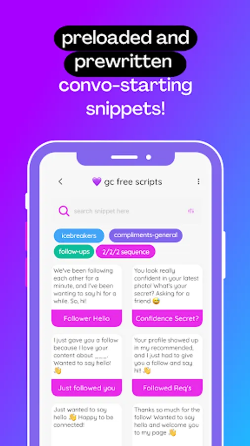 hundreds of free pre-written scripts at your fingertips including 👋 icebreakers 🥰 compliments 👏 cheerleading and more!