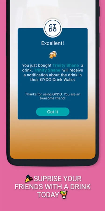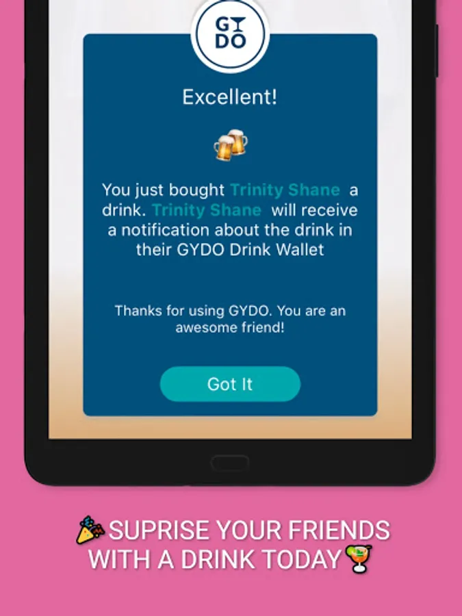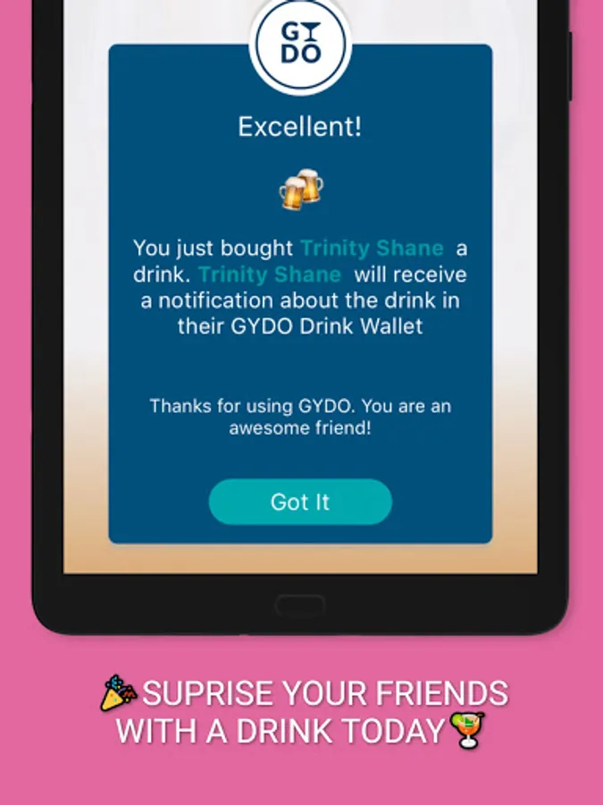 Join the drink gifting revolution and buy your friends a drink with the GYDO app anywhere in the world and well from anywhere in the world.