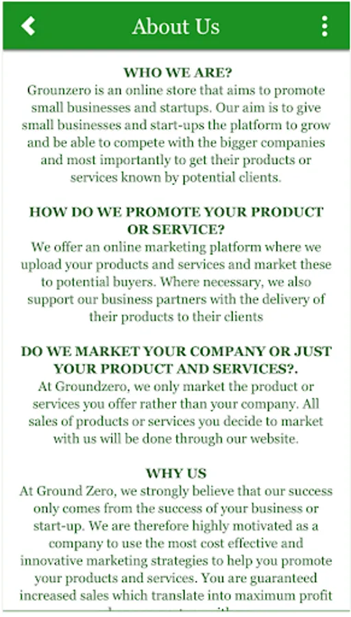 Your one stop shop for all your everyday groceries, fruits& Veg, cosmetic, fashion and other essentials. The Groundzero app replaces the Groundzero website ( www.groundzeroonline.co.za ) which is the fastest growing online shopping site in South Africa. The app offers an easy way to browse our low priced products. The Groundzero app also serves as an online platform where businesses and start-ups can market their products and services to potential clients.