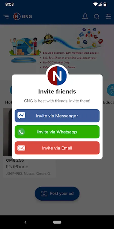 GNG works just like online classifieds portal, but only members can use the platform. Members who wish to sell any goods can upload their advertisements just like one is expected to do in a classifieds portal. Members who wish to buy goods may browse through the listing.