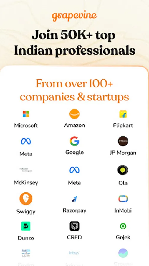 Created exclusively for tech professionals, Grapevine connects you with thousands of people from top companies & startups like Google, Amazon, Zomato, Swiggy, Cred, Paytm, InMobi, GoJek, Accenture TCS, and more.