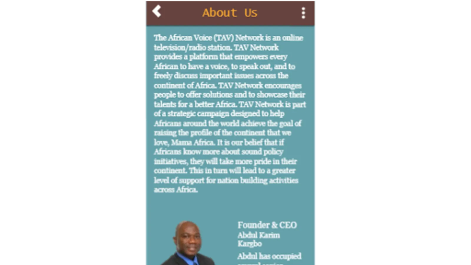 The African Voice (TAV) Network is an online television/radio station. TAV Network provides a platform that empowers every African to have a voice, to speak out, and to freely discuss important issues across the continent of Africa. TAV Network encourages people to offer solutions and to showcase their talents for a better Africa. TAV Network is part of a strategic campaign designed to help Africans around the world achieve the goal of raising the profile of the continent that we love, Mama Africa. It is our belief that if Africans know more about sound policy initiatives, they will take more pride in their continent. This in turn will lead to a greater level of support for nation building activities across Africa.