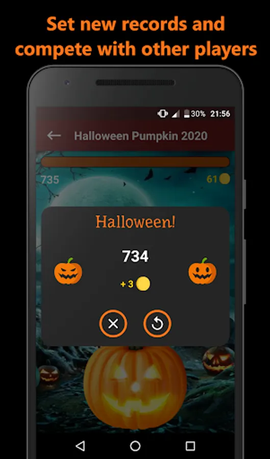 During the game you will come across coins, for which you can buy additional backgrounds and pumpkins.