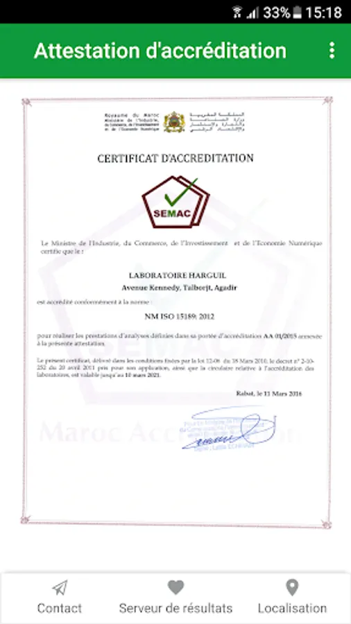 The HARGUIL laboratory obtained the first accreditation according to international standards: NM ISO 15189 issued to a Moroccan laboratory biology analysis (LABM). This is the highest level of international recognition of the competence and quality in this area.