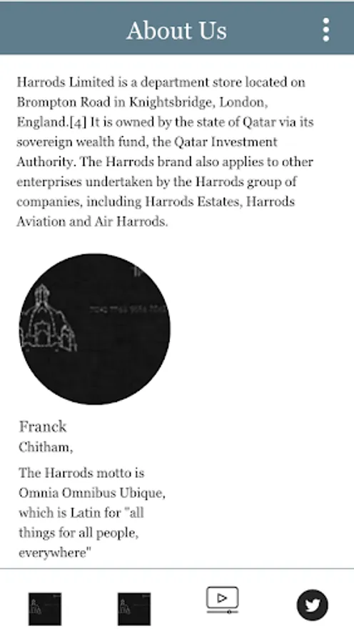 Harrods Limited is a department store located on Brompton Road in Knightsbridge, London, England The Harrods motto is Omnia Omnibus Ubique, which is Latin for "all things for all people, everywhere"