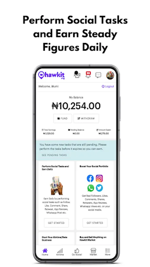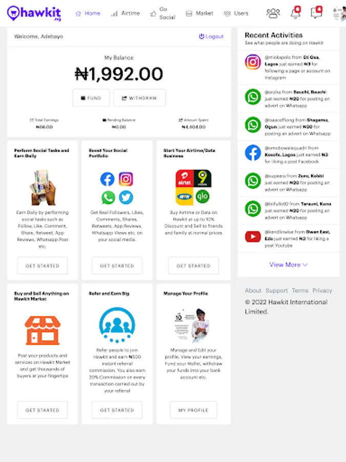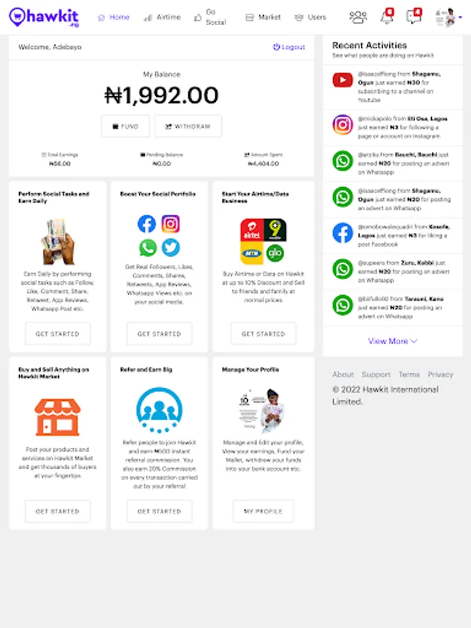 Hawkit is social finance platform that allows you to earn everyday by simply performing popular and easy social tasks such as Following of Social Media Accounts, Liking of Social Media Posts, Commenting on Posts, Sharing of Posts, Subscribing to a channel on Youtube, Posting of Adverts on your Whatsapp Status, App Reviews etc.