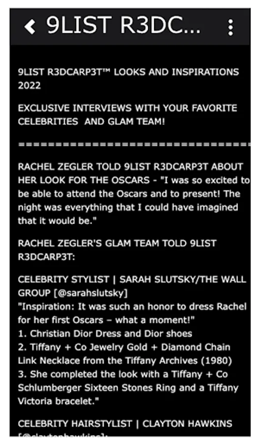 Get exclusive award show interviews from your favorite people with 9LIST R3DCARP3T™. Play the GUESS THE LOOK flash card game, learn about the inspiration and brands behind these iconic styles, and choose your favorites. Share your favorites and looks you want to see in our Forum.