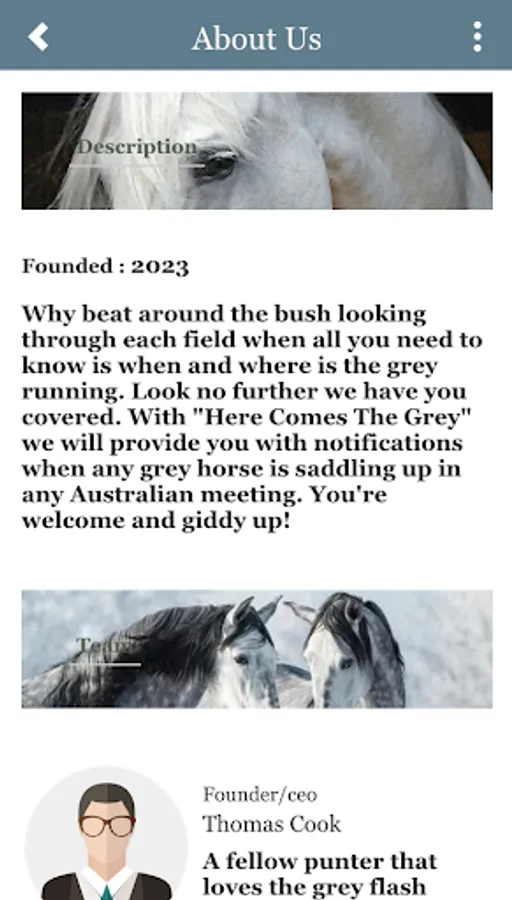 We provide you with information on every grey horse getting a start in any Australian TAB meeting. An easy to use app for any punter to use so giddy up and see you at the races.