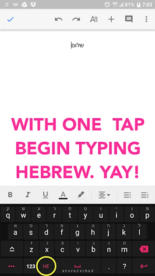 ahavaechad is happy to bring you the worlds first hebrew qwerty keyboard for android and (ios).