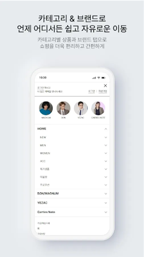 Official shopping mall selling fashion brands such as BON, MAGNUM, YEZAC, and Carries Note.
