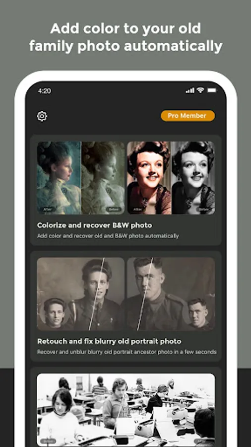 Except for Picture Colorizer, this app also supports more functions, like Old Photo Enhancer - which can enhance the quality of photos and turn blurred images into clear, Old Portrait Retouch - which will enhance facial contour and bring stereoscopic effect.
