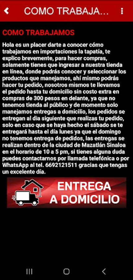 BUYING IN "LA TAPATIA MZT" IS VERY EASY, PLACE YOUR ORDER FROM YOUR CELL PHONE. IN THIS APPLICATION YOU WILL BE ABLE TO DISCOVER OUR PRODUCTS FROM THE ONLINE STORE, AS WELL AS PLACE YOUR ORDER, YOU WILL ALSO FIND INFORMATION ON HOW TO PLACE ORDERS, HOW WE WORK, SEE SOME TESTIMONIALS AND MORE, DOWNLOAD IT NOW.