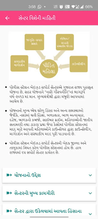 This application provides complete information about 5 different women oriented schemes. Like, details of support centers under the scheme, details of nearest police station and contact number, which can be called directly