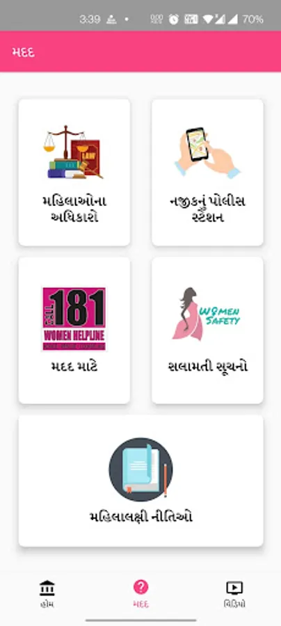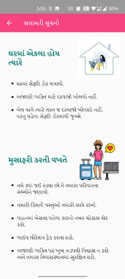 The application includes details of provisions of women oriented laws and punishments for crimes. Safety tips are provided separately in the application for Women.