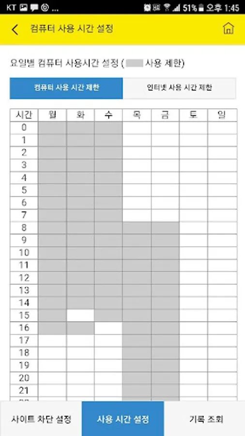 4. Internet use time-out settings (day of week)