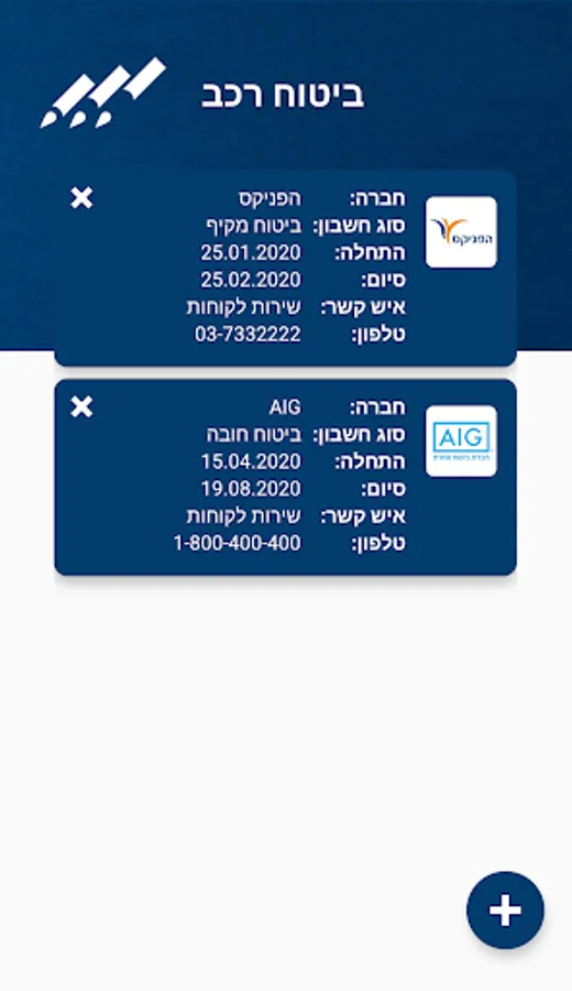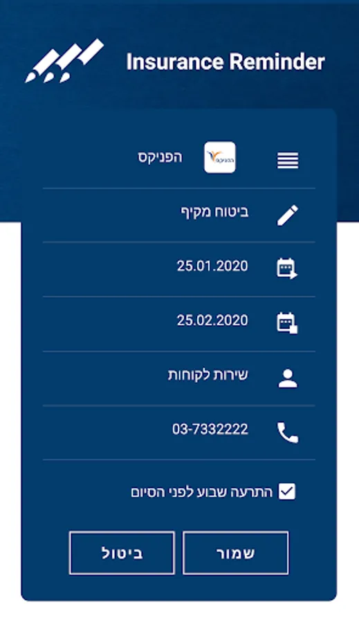 Adding insurance: Choose a company where you are insured, description, start date and end date. You can turn the alert on or off. If you have been alerted - you will see one week before the end of the insurance period and every day for a week.