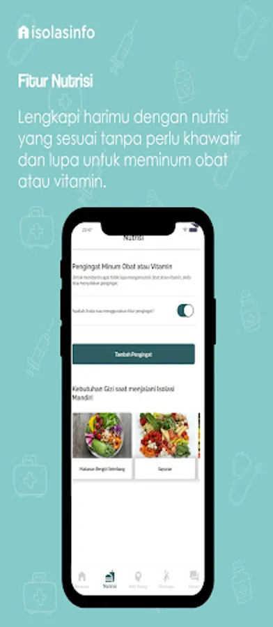 Complete nutritional and nutritional needs during self-isolation with recommendations for nutritious foods, vegetables, and fruits during bath isolation. You also don't have to worry about forgetting to take your medicine because isolation provides a reminder to take your medicine and vitamins._