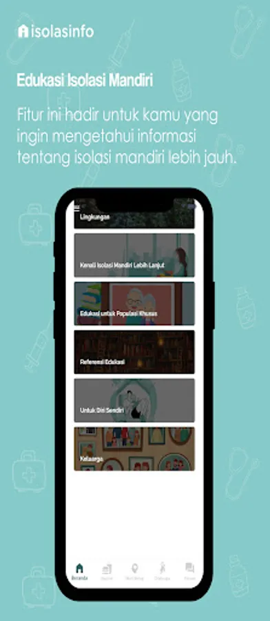 Fill your daily knowledge with information about self-isolation both in the environment, yourself, family, and special populations such as pregnant women, children, and the elderly which are displayed with attractive pictures in the form of cards.